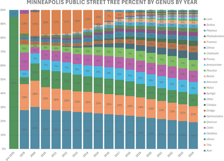 Chart of Minneapolis public street tree percent by genus over multiple years. Pre-1970 was reported in the “Minneapolis Neighborhood Boulevard Reforestation Plan” (Sand et al. 1978). The 1978 data was the intended population from the “Minneapolis Neighborhood Boulevard Reforestation Plan.” The 2004 data is from an i-Tree analysis. The data from 2010 to 2024 is from the Minneapolis Park & Recreation Board public tree inventory system.