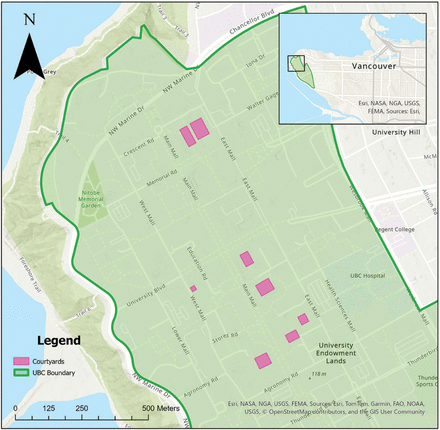 Signs were posted in each courtyard encouraging visitors to participate in a short online survey, along with a QR code link to the survey itself. Student researchers also approached users of the space with the survey link. Because the UBC campus hosts a number of facilities that are used by members of the public—including a hospital, museums, and sports and event facilities—participation was open to undergraduate and graduate students, faculty and staff members, and visitors to campus in order to increase the total number of participants. As a mixed methods study, we did not pre-specify an adequate sample size figure but instead sought to collect enough data to reach saturation during thematic analyses.