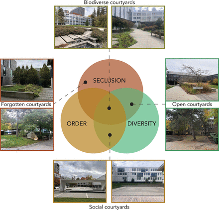 Qualities of campus courtyards. We grouped the 8 courtyards into pairs according to their qualities of biodiversity, order, and seclusion (adapted from Barron and Rugel 2023). Two courtyards scored highly in all three qualities. Four courtyards scored medium for two categories and low in one. Two courtyards scored low in diversity and order, but medium for seclusion.