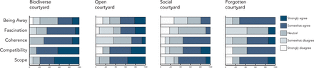 A key finding was that the biodiverse courtyards that measured highest for biodiversity, order, and seclusion were also those that rated highest for restoration according to the PRS scale, with the exception of the ‘being away’ measure (Figure 3). This finding aligned with the student researchers’ pre-study intuitions that more nature would be more restorative. The forgotten courtyards were more highly rated for ‘being away’, perhaps as a result of their smaller sizes and sense of isolation. In general, the biodiverse courtyards were rated more highly across all PRS measures, while the social courtyards had the lowest ratings.