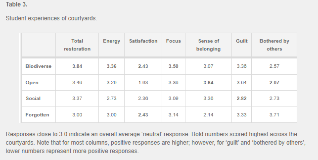 hat said, specific design characteristics of vegetation have been linked to greater restoration, including layered hues and textures, softening harsh edges of buildings, and increasing a sense of seclusion from high-stress environments (Huang et al. 2024). Increasing biodiversity does not always provide conditions for restoration, however (Aleves et al. 2022). Some promising trends were highlighted in our observations and survey, particularly related to the social courtyards. Visitors to the open and social courtyards in our study reported higher scores in the socially relevant domains of our survey, with participants suggesting that they ‘somewhat agree’ that the presence of others contributes to their sense of belonging. Interestingly, the social courtyards had a greater number of students who reported low guilt over taking breaks. Perhaps seeing others taking a break alleviates feelings of guilt from taking a break oneself.