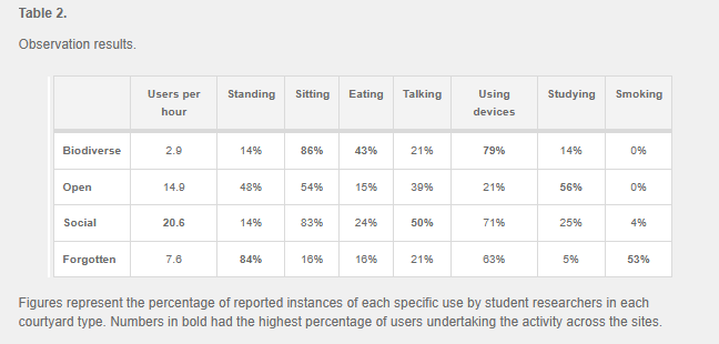 Based on the student researchers’ observations, the number of users at each site varied greatly, ranging from 2.9 to 20.6 per hour, as shown in Table 2. We noticed a divergence in the number of users by courtyard type, with the social courtyards receiving the most visitors per hour, on average. Open courtyards had the second highest number of users, suggesting that university students prefer less-secluded spaces, independent of size. Observational results reveal that higher biodiversity and better maintenance of courtyards were not necessarily valuable characteristics in attracting students. With respect to individual activities, courtyard users were seen eating, talking, watching electronic devices, studying, and smoking. In the social courtyards, talking and studying were primary activities. In biodiverse courtyards, visitors primarily ate and used their phones, while forgotten courtyards were most commonly used for smoking.