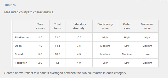 To elucidate the survey findings, we measured the characteristics of each courtyard, including biodiversity, exploring connections between courtyard characteristics and participant responses. Select results on the measured biodiversity, order, and seclusion of the 8 courtyards are shown in Table 1. We report biodiversity in terms of number of species. Some courtyards had only one type of tree, while others had up to ten unique species. Understory diversity ranged from one to seven species. Order was categorized by researchers as ranging from ‘low’ to ‘high’.