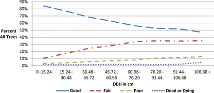 More recently, importance has been given to tree condition because trees in good health provide more ecosystem services than trees in poor health (Hintural et al. 2024). Both i-Tree Streets and Eco incorporate tree condition ratings when estimating ecosystem services and other benefits provided by urban trees. Inventories conducted by IDNR made separate ratings for wood condition and leaf condition in accordance with i-Tree protocols. Each tree received one of four ratings—good, fair, poor, and dead or dying—for wood and for leaves. For i-Tree Streets, these ratings reflect replacement factor percentage values utilized by the Council of Tree & Landscape Appraisers (USDA Forest Service 2010). For i-Tree Eco, these ratings reflect percentages of crown health and dieback (USDA Forest Service 2018). Some, but not all, of the inventories conducted independently of IDNR utilized the same rating scale to make condition ratings for both wood and leaves. Other inventories used the same scale but combined wood and leaves into a single overall rating for tree condition. Since an overall tree condition rating might not agree with separate ratings for wood and leaf condition, inventories that combined wood and leaves into an overall condition rating were excluded from assessing tree condition on the basis of city size, both for all inventoried trees and for prevalent street tree species.