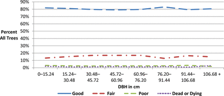 There are many reasons for rating tree condition in a street tree inventory. These include an assessment of tree health, the risk of tree failure, the presence of tree pests and disease, understanding and budgeting for maintenance needs, and calculating compensatory tree replacement cost (Ma et al. 2021). As stated above, Wray and Mize (1985) rated mature tree condition in terms of survivability and the need for corrective maintenance. For example, many trees required minimal pruning and were therefore classified as being in good condition since minimal pruning was not considered a threat to tree longevity. Ratings were intended not only to inform prospective maintenance costs but also to suggest those tree species best suited as street trees in Iowa. Species where 90% or more of trees received good ratings were judged to be acceptable candidates for street trees, and species exhibiting the biggest declines in good ratings as trunk diameter increased were judged to be poor choices.