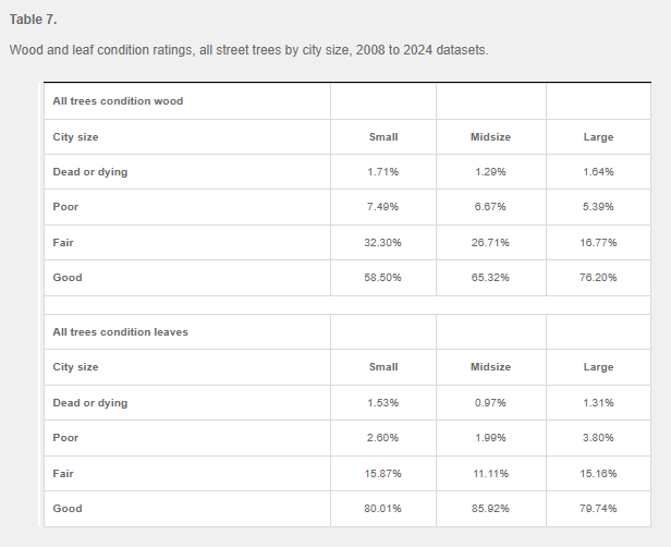 Distributions for tree condition (wood and leaves) were generated from the 2008 to 2024 datasets for all street trees by city size (Table 7). Results for wood condition for all street trees indicated an increase in the percentage of trees with good wood ratings and a decrease in the percentage of trees with fair wood ratings as city size increased. There was a slight decrease in poor wood ratings as city size increased but an increase in dead or dying wood ratings as city size increased from midsize to large. Ratings for leaf condition for all street trees did not reflect a clear trend as city size increased. Results for midsize cities were inconsistent.