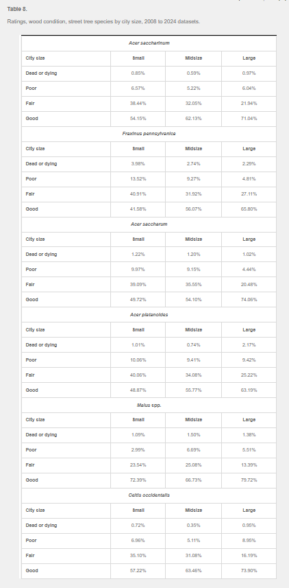 Distributions for wood condition and for leaf condition were also generated from the 2008 to 2024 datasets for prevalent street tree species by city size. Results for wood condition for all prevalent street tree species indicated an increase in the percentage of trees with good wood ratings and a decrease in the percentage of trees with fair wood ratings as city size increased (Table 8). The percentage increase in good wood ratings as city size increased was greatest for A. saccharum and least for Malus spp. Between small and large cities, there was an increase in dead or dying wood ratings for all species except for F. pennsylvanica and A. saccharum and a decrease in poor wood ratings for all species except for Malus spp. and C. occidentalis. Results for leaf condition for prevalent street tree species did not indicate a clear trend as city size either increased or decreased (Table 9). In fact, for all species except C. occidentalis, the largest percentages of trees with good leaf condition ratings were associated with midsize cities.