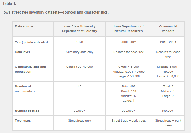 Iowa is the 23rd largest of the 50 states comprising the United States, with a land area of 144,659 km2 (55,853 mi2) and a population of 3.24 million (US Census 2024). The state is divided into 99 counties which in turn contain 948 cities and 86 Census Designated Places (CDPs)(Iowa State Data Center 2025). A CDP is a densely settled population center that has a name and community identity and is not part of any incorporated place (US Census 1994). The state also contains townships which are administrative subdivisions of counties that provide limited functions such as fire protection, cemetery management, fence maintenance, and boundary dispute resolution in rural areas outside the scope of counties and cities (Story County Iowa 2025). Somewhat confusingly, Iowa’s small rural incorporated communities are often referred to as towns. For example, the 3 papers written by Wray and Jungst (1981), Wray and Prestemon (1983), and Wray and Mize (1985) referred to the 40 municipalities where street tree inventories were conducted as towns, when, based on state code, they are more accurately cities (Iowa General Assembly 2025). For the purposes of this study and to avoid confusion, the state’s small rural incorporated communities will be referred to as cities.