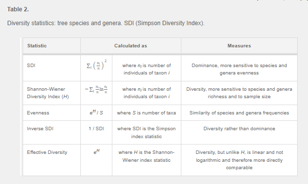 In addition to relative abundance, other metrics commonly used to assess the diversity of street tree species and genera include the following diversity statistics (Table 2): the Buzas and Gibson evenness index (Buzas and Gibson 1969), which appraises the degree to which all species and genera abundances are divided equitably within the species and genus distributions; the Simpson Diversity Index (SDI) (Simpson 1949), which evaluates the dominance of species and genera within those distributions and is sensitive to species and genera evenness; and the Shannon-Wiener Diversity Index (Shannon 1948), which is more sensitive to species and genera richness than to evenness in gauging diversity. Additionally, the Inverse of the Simpson Diversity Index (Inv SDI or 1/SDI) is sometimes preferred to the SDI because its values increase inversely to dominance and therefore equate more clearly with diversity (Sun 1992; Sreetheran et al. 2011), and effective diversity (eH where H is the Shannon-Wiener Diversity Index value) is sometimes preferred to Shannon-Wiener because, unlike Shannon-Wiener, its scale is linear and not logarithmic, and the statistic is therefore more directly comparable (Jost 2006).