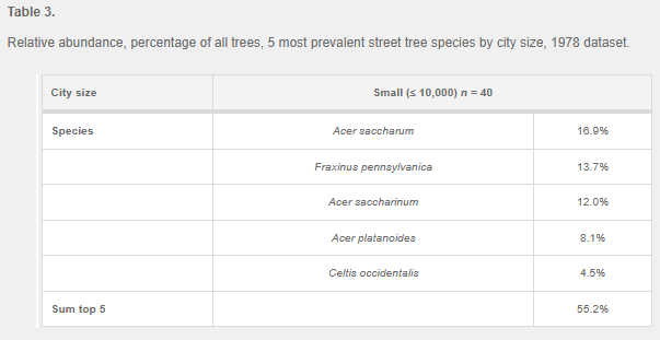 For the 40 small cities comprising the 1978 dataset, Acer saccharum (sugar maple, 16.9%) was found the most common street tree species, followed by Fraxinus pennsylvanica (green ash, 13.7%), A. saccharinum (silver maple, 12.0%), A. platanoides (Norway maple, 8.1%), and Celtis occidentalis (northern hackberry, 4.5%)(Table 3). Relative abundance percentages for street tree genera were not reported, but the 3 Acer (maple) spp. above account for 37.0% of all inventoried street trees. For the 2008 to 2024 datasets, A. saccharinum (14.52%) was found to be the most abundant species in small and midsize cities and Malus spp. (crabapple, 10.51%) the most abundant species in large cities (Table 4). Percentages of A. saccharinum, F. pennsylvanica, and A. platanoides slightly exceeded Santamour’s 10% benchmark for species relative abundance in small and midsize cities, but not in large cities. At the genus level (Table 4), Acer spp. was found to be the most abundant genus in small, midsize, and large cities. The percentage of Acer spp. substantially exceeded Santamour’s 20% benchmark for genus relative abundance in small and midsize cities but only slightly exceeded that benchmark in large cities. Little difference was found between small and midsize cities in the summed percentage of the 5 most prevalent street tree species. However, the summed percentages of the 5 most prevalent street tree species and genera in large cities were found to be substantially less than the summed percentages in small and midsize cities.