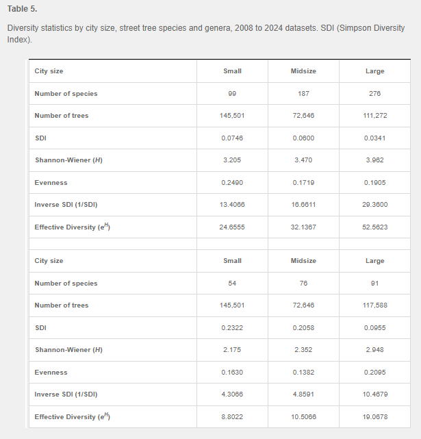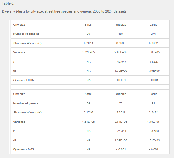 In addition to assessing street tree diversity based on relative abundance percentages, statistics were calculated for the 2008 to 2024 datasets at species and genus levels for SDI, the inverse of the SDI (Inverse SDI), the Shannon-Wiener Diversity Index, distribution evenness, and effective diversity (Table 5). For street tree species and genera, the Inverse SDI and effective diversity increased as city size increased, as did species and genera richness (i.e., the number of species and genera). Increases were larger between midsize and large cities than between small and mid-size cities. Results for distribution evenness were mixed. Evenness for street tree species declined from small to large cities while evenness for street tree genera evenness increased from small to large cities. Lastly, diversity index t-tests (Hutcheson 1970) assessed the statistical significance of differences in the Shannon-Wiener Diversity Index for all street tree species and genera between city sizes. Statistically significant increases (P < 0.05) were found in the Shannon-Wiener Diversity Index for both street tree species and genera between successive city size classes (i.e., diversity increased significantly from small to mid-size cities and from midsize to large cities)(Table 6).