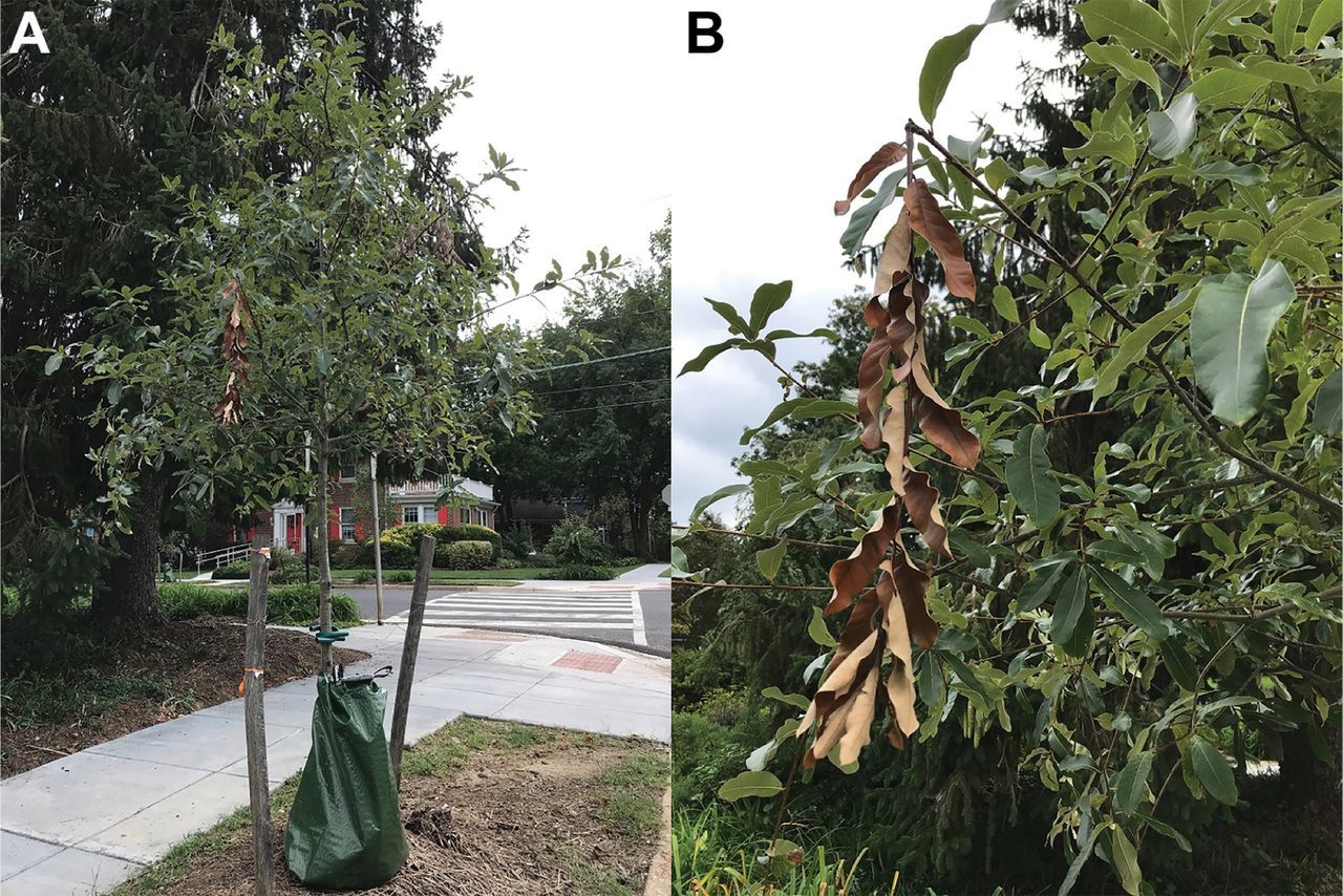 Flagging and dieback in (A) shingle oak street tree (Quercus imbricaria) and closeup (B) showing flagging in the District of Columbia.