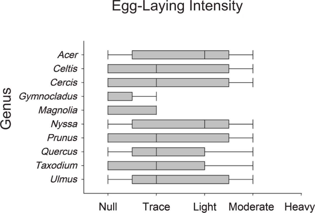 Egg-laying intensity in newly planted trees by genus. Egg-laying intensity was estimated as 0% Null, 1% to 24% Trace, 25% to 49% Light, 50% to 74% Moderate, and 75% to 100% Heavy (n = 175). The bars indicate the lower and higher confidence interval, the vertical line in the middle of the bar represents the means, and lines extending from the bar represent the minimum and the maximum.