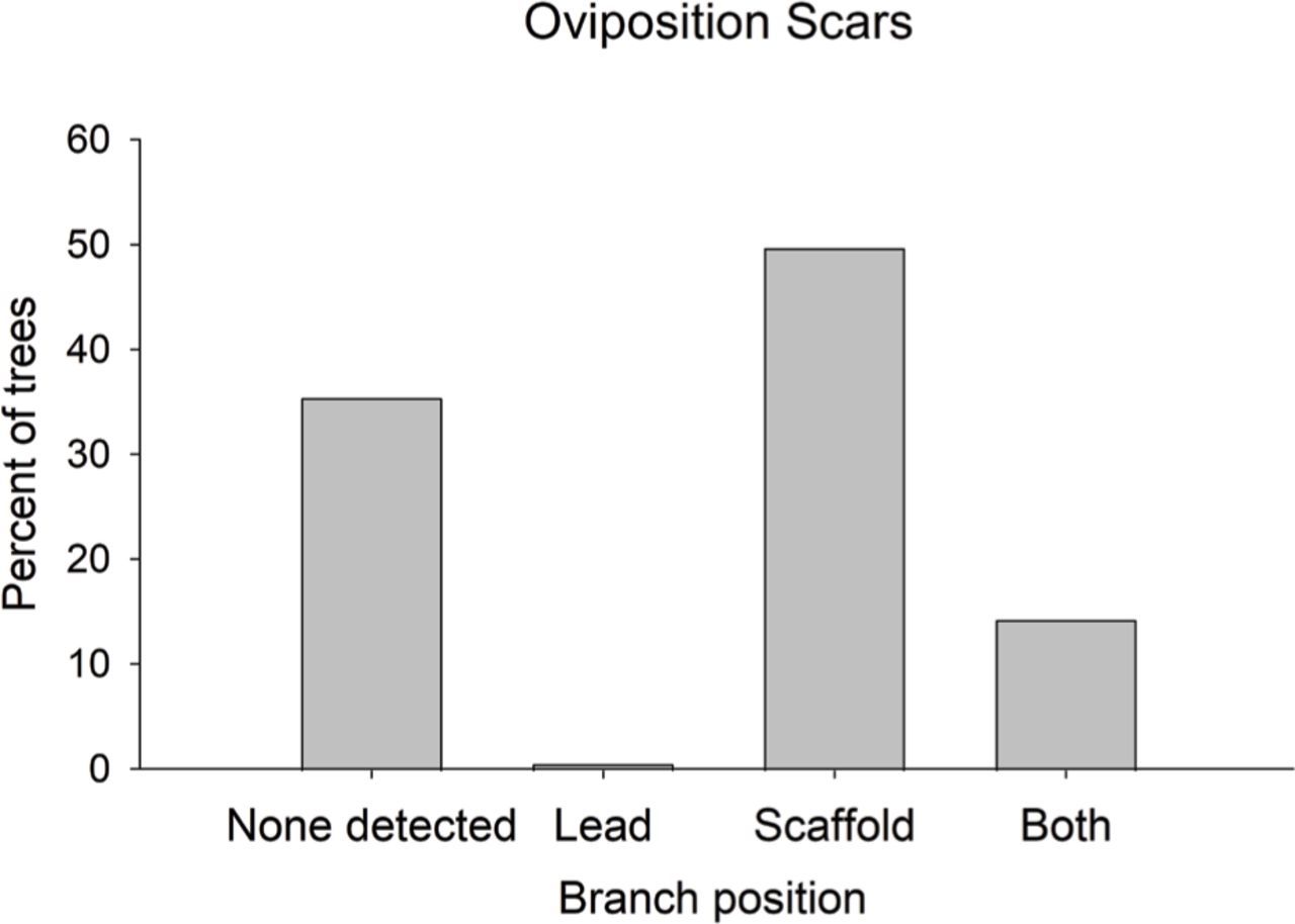 Percent of tree which had oviposition scars on lead branches, scaffold branches, both branch positions, or no oviposition damage (n = 175).