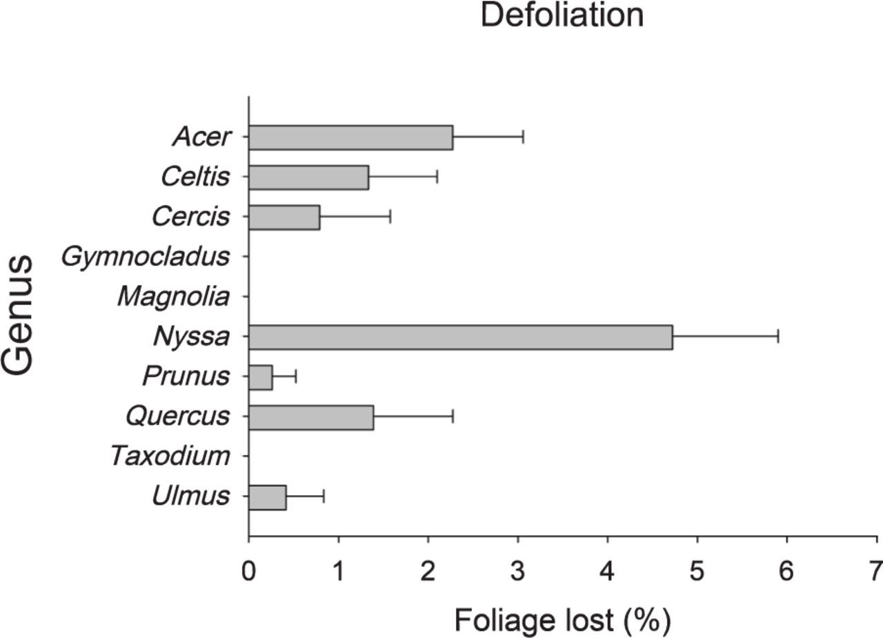 The percent of foliage lost was low but was significantly different among genera (F = 4.59; df = 9, 160; P = 0.005)(Figure 5). Nyssa had the highest reduction of foliage with an average of 4% of foliage lost followed by Acer with 2%. Foliage lost was statistically similar among the rest of the genera (Celtis 1.33%, Cercis 0.79%, Gymnocladus 0%, Magnolia 0%, Prunus 0.26%, Quercus 1.38%, Taxodium 0%, and Ulmus 0.42%). According to the ordinal regression analysis, egg-laying intensity was related to the percent foliage lost (Wald test, X 2 = 21.79, df = 1, P = 0.005) which indicated that the dieback recorded was caused by the cicada damage during the egg-laying process.
