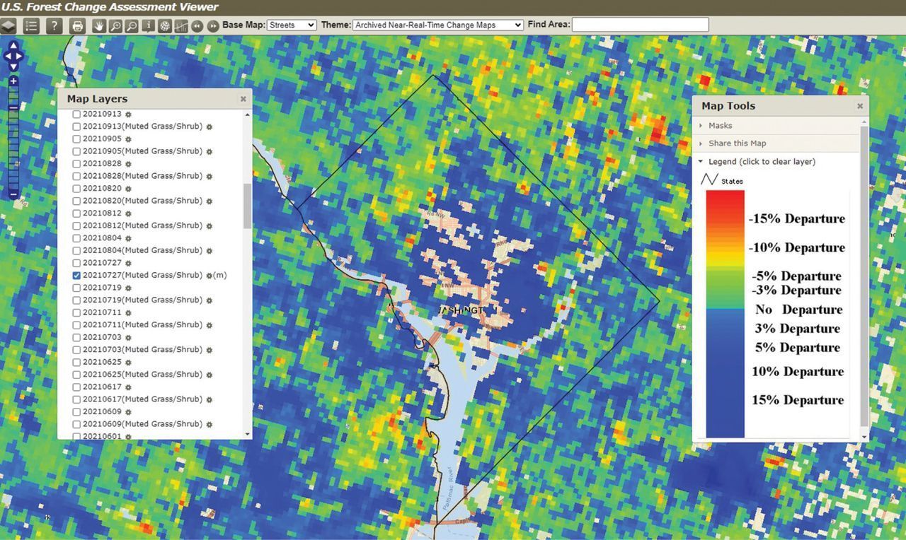 Screen capture from ForWarn II from the 2021 July 27 cycle for the District of Columbia, in addition to adjacent states of Maryland and Virginia. Resulting map included few larger areas of disturbance when reported cicada damage was widespread.