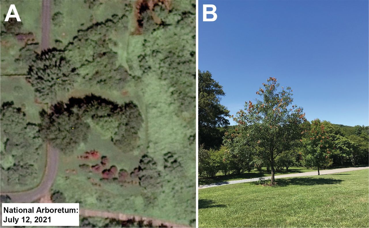 (A) Cicada damage visible from Worldview-2 satellite imagery at the National Arboretum, District of Columbia in July 2021; (B) ground photo of the trees with flagging symptoms in the National Arboretum taken in July 2021.