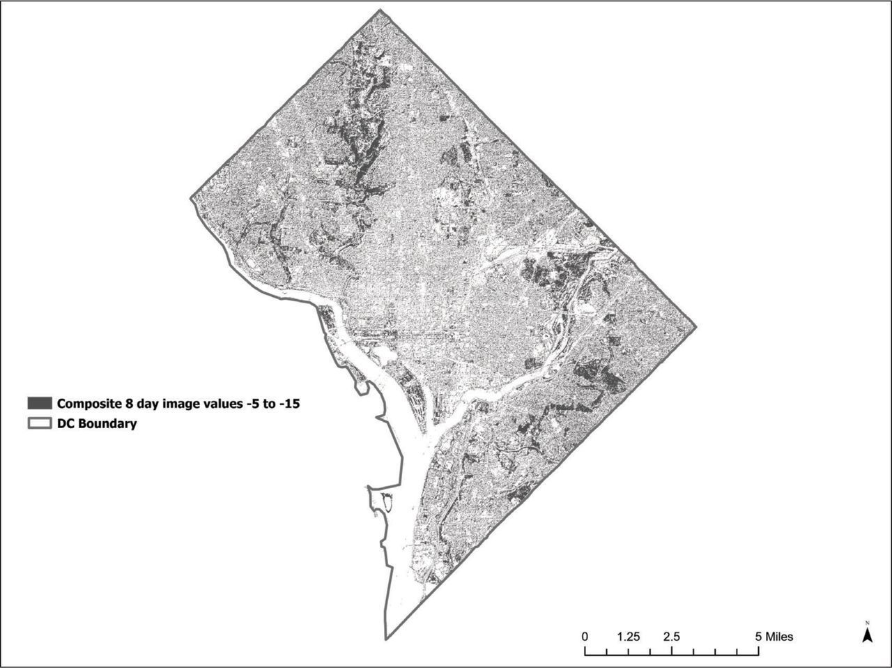 High resolution (10 m) NDVI data derived image from 2021 August 8th that utilized the target threshold of −5% to −15% reduction in NDVI. Image cut to show 2020 canopy layer for the District of Columbia, and the white areas represent no canopy cover.