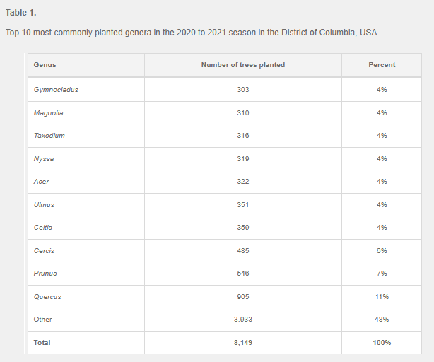 This research was supported in part by the USDA Forest Service, Forest Health Protection Core Funding to the District of Columbia, District Department of Transportation (21-DG-11094200-163). The District of Columbia Forest Health Coordinator Kasey Yturralde’s salary was partially funded by USDA Forest Service Forest Health Protection Core Funding in federal fiscal years 2021 and 2022. The authors would like to thank the following individuals for their contributions as related to data access: Rowan Moody with Red Bird Consulting (aerial imagery), Chris Hayes with the USDA Forest Service Forest Health Protection (ForWarn Imagery), data analyst Steve Norman and US Forest Service Region 8 Research Team (HiForm), and John Stanovich, retired from the US Forest Service (error matrix statistics). Thank you to Ida Holaskova with West Virginia University, Davis College for her invaluable assistance with statistical analysis. Thank you to the District Department of Transportation Urban Forestry Division staff for their support in the planning and implementation of the annual tree survival study, particularly Earl Eutsler and Simoun Banua.