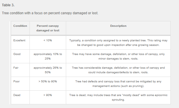 Each tree surveyed was first inspected for standard tree inventory data collected by District Urban Foresters, such as tree condition, size measured as diameter at breast height (DBH), and date of inspection (Table 3). Tree condition was defined broadly based on a combination of criteria that include condition of the stem and branches, aboveground roots, and crown vigor. Cicada survey data were collected by the District Forest Health Coordinator using Arc-GIS Collector (iOS app version 21.0.4) by slowly walking around the tree, conducting a 360° visual inspection of each tree. Trees were evaluated for percent foliage loss, presence/absence of egg-laying scars, location of oviposition scars (lead stem, scaffold branches, or both), and egg-laying intensity estimated as percentage of branches with oviposition scars: 0% Null, 1% to 24% Trace, 25% to 49% Light, 50% to 74% Moderate, and 75% to 100% Heavy.