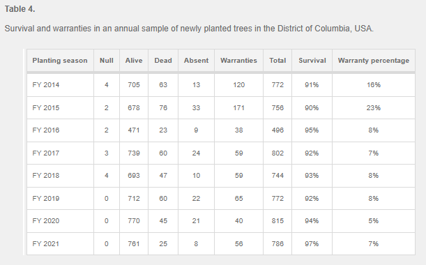 Because the trees used in this trial were located in different parts of the city with different habitats, and a complex mix of private and public ownership, we used a visual ground field assessment “line of sight” method to estimate cicada activity in the area around the individual tree. This was accomplished by estimating the percentage of visible trees showing cicada damage (flagging): 0% Null, 1% to 24% Trace, 25% to 49% Light, 50% to 74% Moderate, and 75% to 100% Heavy in a 360° arc around the tree. The Urban Forestry Division’s annual evaluation of newly planted trees was used to compare survivorship of trees the year of cicada emergence to previous years. Urban Forestry Division inspects newly planted trees immediately after 1 growing season, and 1 year later (after 2 growing seasons). The first inspection of newly planted trees confirms that trees are in Good or Excellent condition (Table 3) by District Urban Foresters. Any trees identified with a condition of Fair, Poor, or Dead are replaced per the tree planting contract. Such trees require a warranty replacement; this is reflected in Table 4. After 2 growing seasons, a sample of newly planted trees (approximately 10%) are evaluated for survival, condition, and several traits related to the urban environment. Additionally, observations of pest and pathogen presence are evaluated per the i-Tree Inventory and Pest Evaluation Detection (IPED) protocol (USDA Forest Service 2010). Newly planted trees are evaluated after 2 growing seasons. For example, the tree cohort planted between October 2020 and April 2021, just prior to the emergence of Brood X, were evaluated for survival in the fall of 2022. A total of 786 trees were evaluated, out of 8,149 planted between 2020 to 2021. The 786 trees evaluated consisted of the following sample sizes for each of the 10 genera referenced above: Acer = 39; Celtis = 26; Cercis = 48; Gymnocladus = 23; Magnolia = 28; Nyssa = 44; Prunus = 68; Quercus = 78; Taxodium = 33; and Ulmus = 38. Survival and condition of these 786 trees in fall 2022, after Brood X, was compared to survival rates from previous years. Occasionally, upon inspection, trees are missing from the planting location; these trees are identified as “Absent” in the survival study (Table 4).