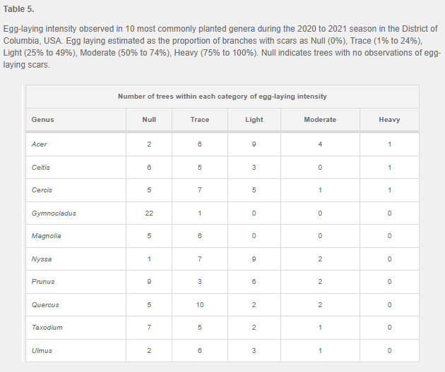 There were significant differences in egg-laying behavior among 10 tree genera, with the most damage observed in Acer and Nyssa. Egg laying occurred most often in scaffold and lateral branches. Egg-laying intensity was positively correlated with percent foliage lost. There was little evidence of cicada impacts on tree health as tree condition was unrelated to egg-laying intensity. Survival of the 2020 to 2021 tree cohort was similar to previous years without a large-scale cicada emergence. Remote sensing was unsuccessful in differentiating cicada caused damages from other damage.