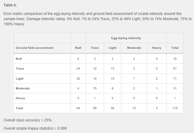 Most sampled trees were located in areas with Trace (31%), Light (41%) and Moderate (18%) cicada damage (Figure 3). In contrast, 9% of sampled trees were in areas with no damage and only 1% in heavily damaged areas. This indicates that the damage a street tree experienced was not related to the estimated cicada damage of the surrounding public or private trees. Indeed, results of the kappa analysis showed that there is no agreement (K = 0.008) between egg-laying intensity and ground field assessment of cicada intensity around the sample trees (Bowker’s test of Symmetry of Disagreement; Chi-Square = 54.85, df = 10, P < 0.001)(Table 6). Similarly, the ordinal regression analysis between the estimated cicada activity in the area (ground field assessment of cicada intensity) around the individual trees and egg-laying intensity was not significantly different (Wald test, X2 = 4.80, df = 4, P = 0.307).