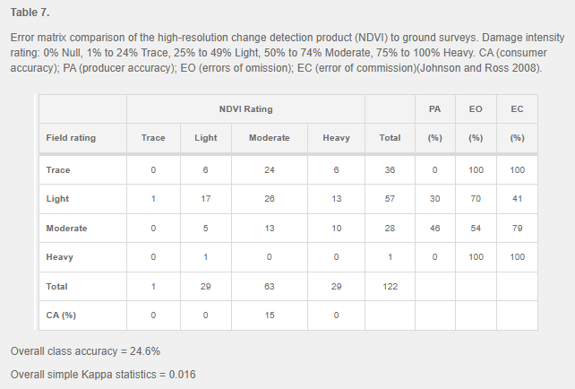 The error matrix follows Johnson and Ross (2008) and contains columns and rows and diagonals to calculate the following statistics: the overall accuracy, omission error, commission error, the consumer’s accuracy, producers’ accuracy. To measure the degree of agreement between the two rating systems (field inspections and NDVI), the kappa statistic and Bowlers’ test of symmetry were calculated using Proc FREQ with the AGREE options in SAS.