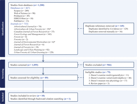PRISMA diagram of the systematic literature review for studies on the effect of mulch depth on tree physiology (Page et al. 2021a). Journals marked with an asterisk (*) did not offer .ris export options for search results; therefore, study records were manually compiled into a .ris file and uploaded to Covidence.
