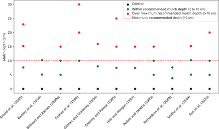 While studies have identified the minimum mulching depth required to improve soil health, plant growth, and weed control (Chalker-Scott 2007), there is no clear maximum depth from peer-reviewed literature. Further research should seek to identify maxima based on mulch type. We recommend that future studies consider 5 items in their research design and reporting.